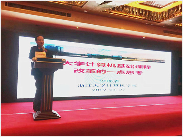 会上浙江大学计算机基础教学中心主任许端清教授讲了大学计算机基础课程教改理念与思路,浙江工业大学的龙胜春老师、浙江师范大学的马永进老师、浙江农林大学暨阳学院的李英杰等各兄弟院校的计算机公共教学负责人分享相关教学实践经验。浙江大学的陈春晖教授2005年就开设了python课,他介绍了Python程序设计课程体系与教学经验分享,带给了我们耳目一新的感觉,让我们深知Python的教学的方法不同于以前的C和VFP的教学,要侧重于Python语言本身的无穷魅力和丰富的第三方库。浙江大学最受员工欢迎的陈越“姥姥”的“面向程序设计能力培养的在线生态建设”,中文MOOC第一人的翁恺的“Python程序设计的翻转课堂与慕课教学方案”以及季江民的“面向Python的程序设计语言课程教学供给侧改革”,干货满满,内容精彩纷呈。最后教育部高等学校大学计算机课程教学指导委员会副主任何钦铭做总结发言,他梳理了二十多年来大学计算机基础课程体系的演变历程,结合“新工科”建设,介绍了当前全国和全省关于大学计算机基础课程教学改革的方向及思路,并提出教学改革的重要目标是培养员工的计算思维和融合创新能力。