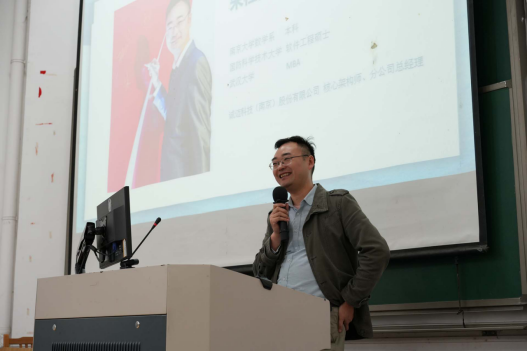 李秋晴老师向同学们介绍了本次讲座的嘉宾——朱桂勇,南京大学本科,武汉大学工商管理硕士,国防科学技术大学软件工程硕士,系统架构师、PMP、AMBA。曾任南京诚迈科技(南京)股份有限公司技术总监、集团公司核心架构师、分公司总经理,主持参与千万级经费项目数十个,涉及方向包括各类行业信息化软件系统、国产操作系统、人工智能(AI)等。